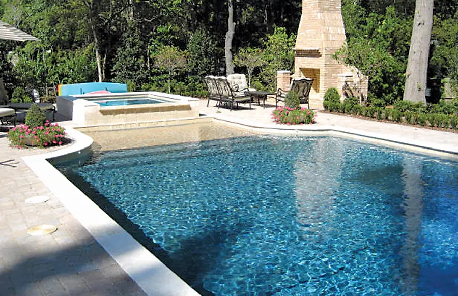 Rectangle swimming pool with lounge chairs on tanning ledge and curvy pool with bubbler fountains on entry step.